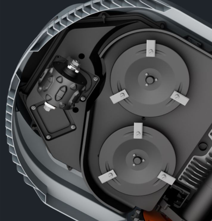 Dank des Doppelmessersystems wird das Gras effizient und gleichmäßig geschnitten. Das schwebende Mähdeck passt sich Bodenunebenheiten automatisch an und sorgt für ein perfektes Schnittbild.